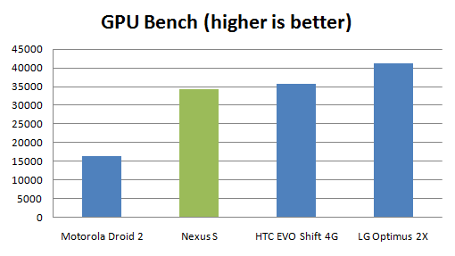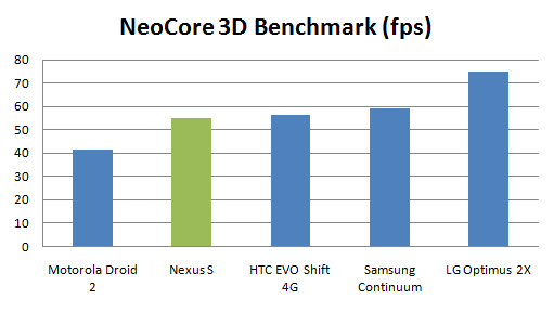 The Nexus S is particularly good at executing Javascript, according to the SunSpider 0.9.1 benchmark. This is very important to Google because the company is pushing web apps and HTML5 very hard.