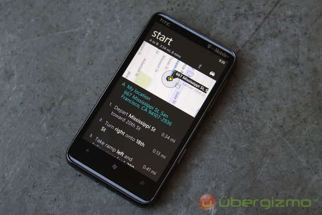 Tested against Google Maps on the iPhone and the Nexus S, it got a current location fix at the same speed with a similar accuracy (number 77 instead of 99 and number 42 instead of 99 in the right street), the Nexus S displayed the icon on the right spot on the map but the application did not provide the street number at all. When I searched for directions to a restaurant, I tried 3 different ones that I never tried in my iPhone 4, both the iPhone 4 and the Nexus S returned instant results (one or two second) but the HD7 needed 45 seconds to display the directions, I tested it several times with restaurant names or full addresses, and the HD7 was consistently the slowest to return results compared to the other two phones. Note that the Samsung Focus running WP7 returned the results faster than the iPhone 4 when I tested the feature on both devices  three months ago.  I was indoors (at my desk, in my office) when I performed this test both times, and all devices were connected to WiFi – I have no clue as of why the HD7 is slower to return directions over WiFi, since it features the same OS and has the same SoC (hardware platform) as the Focus.