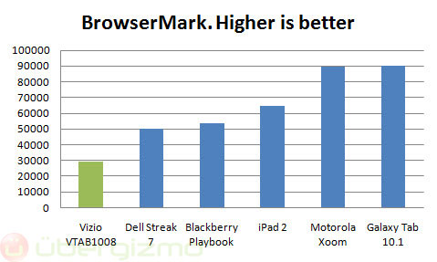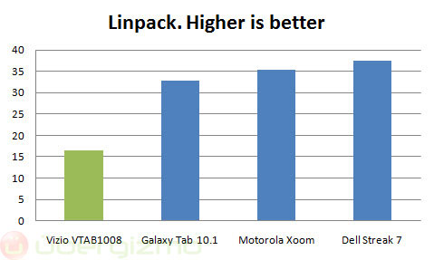 In some benchmarks (like GUIMark2), the Vizio tablet has the advantage of having less pixels to process as it has a lower display resolution than the Galaxy Tab 10.1/Xoom and other recent Honeycomb tablets.