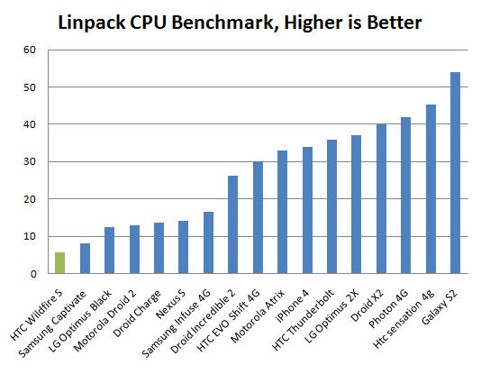 The Linpack benchmark shows that the raw number-crunching capabilities is 8 times lower than the fastest HTC smartphone (the HTC Sensation) on the market.