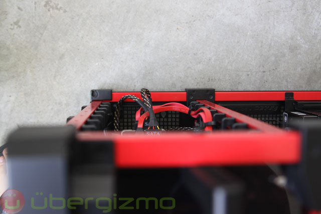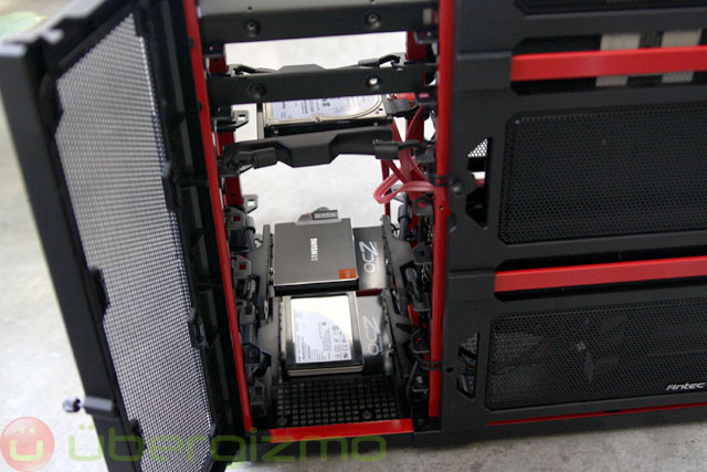 Once everything has been put in place, you’ll realize that cable management was not so easy (or not so clean). I did not go out of my way to hide cables, but even if I wanted to, the lack of room in the back of the motherboard makes it impossible to sneak cables behind because there is not much space between the motherboard plate and the mesh enclosure. Antec should change the design slightly to accommodate hiding cables on the side.