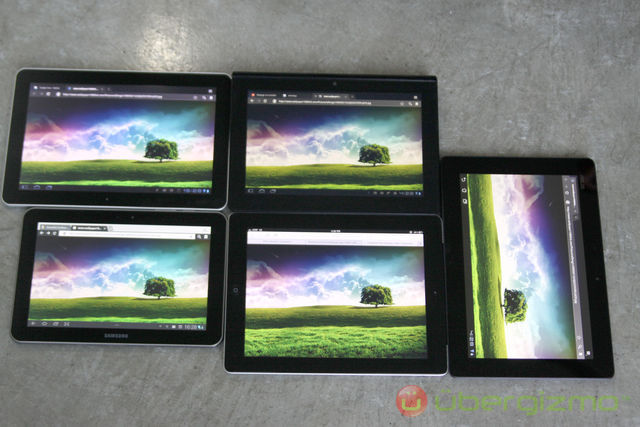 Top left Samsung Galaxy Tab 10.1 – Bottom Left Samsung Galaxy Tab 8.9 – Top Middle Sony Tablet S – Bottom Middle iPad 2 – Right Asus Transformer Prime
