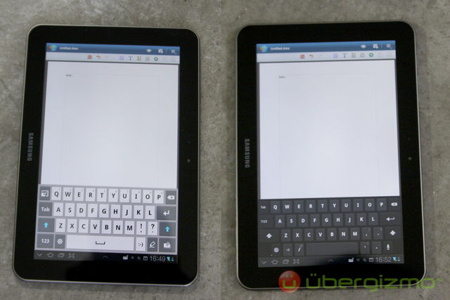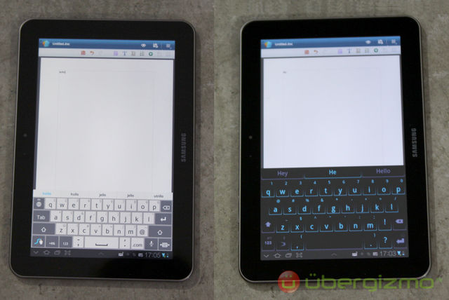 The Samsung Galaxy 8.9-inch offers the default Android keyboard, the Samsung one and