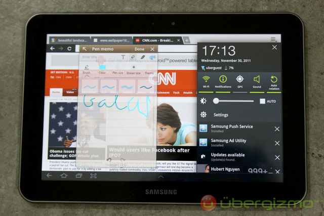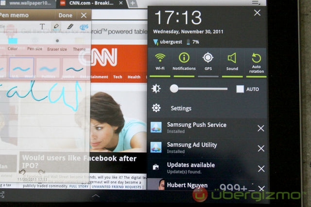 Another cool enhancement of the regular Android interface is the customization of the Quick Access panel, accessible by taping on the right side of the task bar, from there, thanks to TouchWiz, you can now switch on/off WiFi, notifications, GPS, sound and auto rotation. All kinds of notifications are available from the panel, including email, calendar, and application updates.