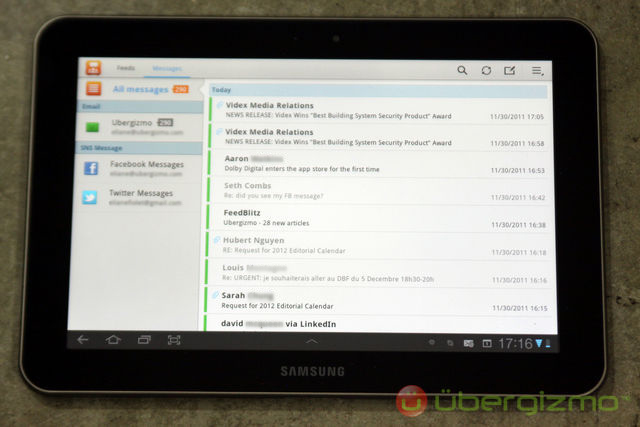 Samsung provides its own social messaging application (read in the TouchWiz paragraph above), that aggregates all your messages from various sources, including multiple email accounts, Facebook,Twitter and Linkedin, in one place. Personally, I like the app a lot, it increases my productivity on a daily basis. I wish a similar application could be offered in the basic Android package. Note that for LinkedIn, you can only see the public updates but not the private messages that epople send durectly in your LinkedIn inbox.