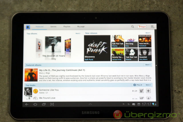 Music Hub is part of the Samsung software customization, it offers a music store and a music library management under the same roof, unlike the Google Music app or the Apple Music app on the iPad 2 (you need to go to iTunes to buy). You can add each song in your playlists and directly buy them from there after listening the 30 seconds preview, I wish I could do that from the Google Music application.