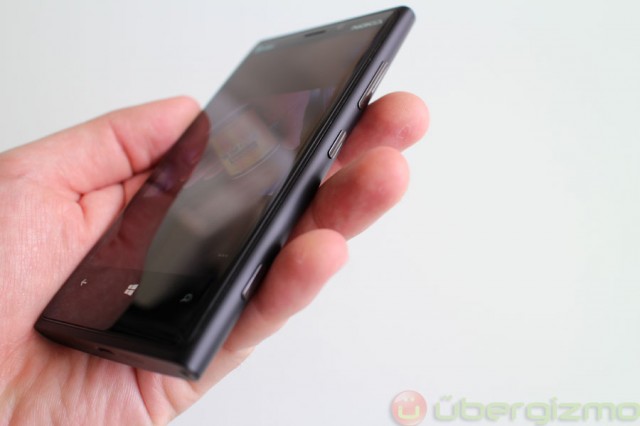 When holding the Lumia 920 with the right hand, the power should be easily accessible from the right thumb at the top of the right side of the device, above the volume button which is conveniently accessible with the thumb as well. The top right spot is also easy to operate for left handed people using the left index.