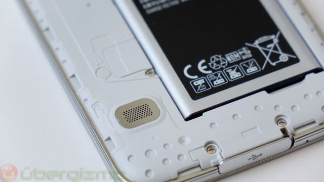 At the bottom of the back cover, there is an opening for the loud speaker which looks similar to the Galaxy S4 from the outside. When you pop the back cover, you will see the the speaker grill of the Galaxy S5 is in fact significantly smaller. I have also noted the presence for a wireless charging back cover, and although Samsung has not mentioned such an accessory in their product line, they have confirmed to Ubergizmo that the wireless charging cover will be coming down the road.