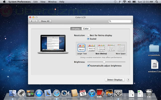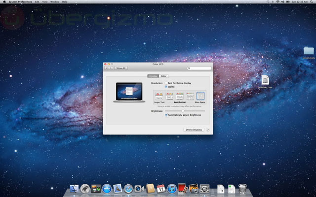 After installing the graphics drivers, a reboot will put you into the maximum 2880×1800 resolution. While it is amazingly sharp, it is also amazingly not readable for most (if not all) people. Even with a 20/20 vision, I’m having a hard time working in this native resolution with such a small screen. I’ve uploaded some full-sized screenshots to our Ubergizmo Flickr account. Check them out.
