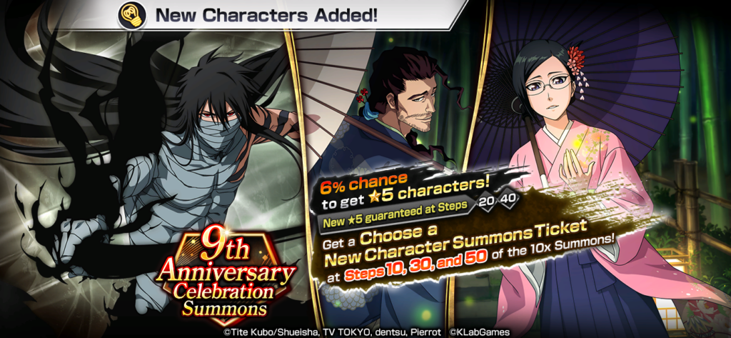 This Summons features the 9th Anniversary Renewed version of Ichigo Kurosaki and the Japanese Parasol 2024 versions of Shunsui Kyoraku and Nanao Ise!